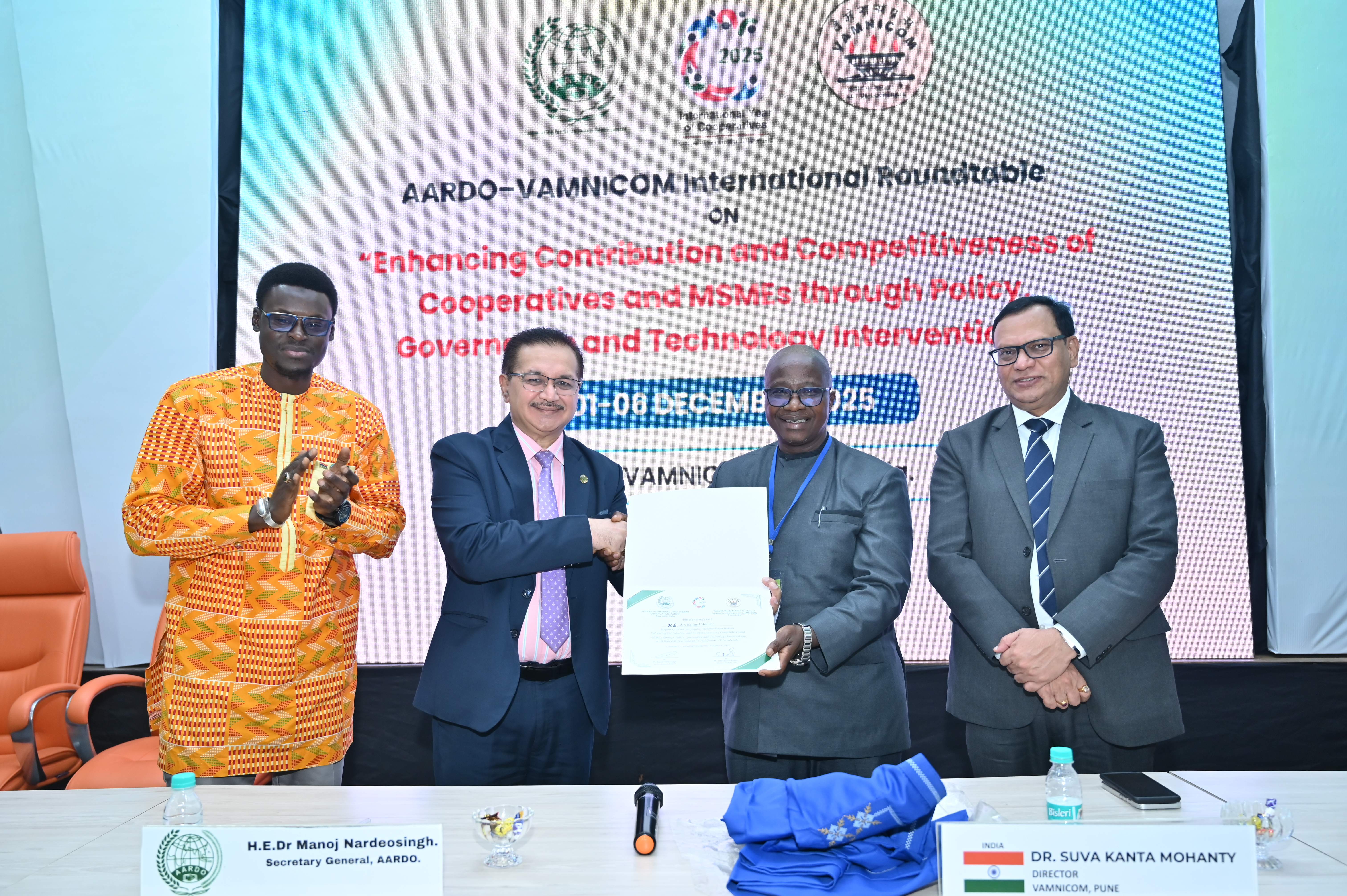 Commemorating the International Year of Cooperatives, the African-Asian Rural Development Organization (AARDO), in collaboration with the Vaikunth Mehta National Institute of Cooperative Management (VAMNICOM), Pune, successfully organised the International Roundtable on “Enhancing Contributions and Competitiveness of Cooperatives and MSMEs through Policy, Governance and Technology Interventions” during 1-6 December 2025. The Roundtable brought together policymakers, senior government officials, academicians, cooperative leaders and development practitioners from 16 AARDO Member Countries and Premier Institutes/ Universities across Africa and Asia i.e. Eswatini, Gambia, Ghana, India, Jordan, Kenya, Lebanon, Liberia, Malaysia, Mauritius, Morocco, Namibia, Nigeria, Oman, Sri Lanka, Zambia and two delegates from an International Organization from Moscow, Russia.